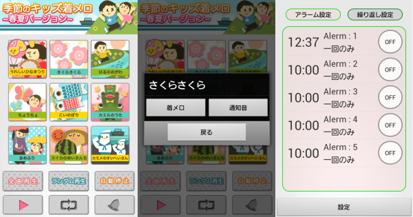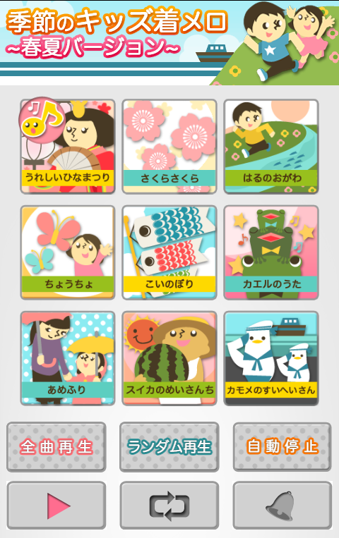 「季節のキッズ着メロ~春夏Ver~」は、Android端末にて子供向けの童謡を再生できるアプリケーションです。春~夏の季節にぴったりの童謡定番曲を、高音質の着メロを収録しています。