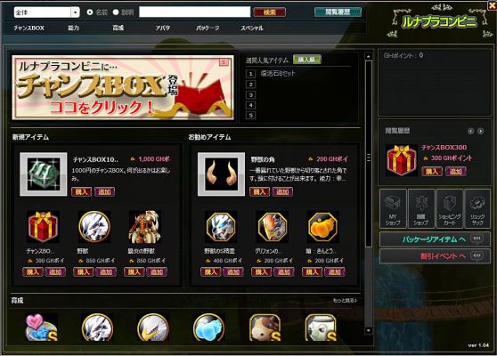 ガリアレボリューション株式会社(代表取締役:森田 英嗣 以下ガリアレボリューション)の運用するオンラインゲーム提供サイト「GAME HEART(ゲームハート)」は、サイバードグループでモバイルメディア事業を手掛ける株式会社エスクルー(代表取締役:小林理 以下エスクルー)が提供する3D・MMORPG『ルナティアプラス』内の「ルナプラコンビニ」にて、本日2013年2月12日より新たに「季節物チャンスBOX」他、新アイテムの販売を開始したことをお知らせいたします。