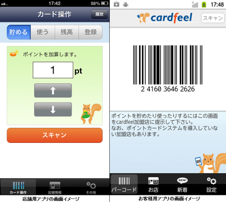 cardfeelは、得意客を増やしたい店舗のためのクラウド型ポイントシステムです。このシステムはシステム端末として動作する店舗用アプリと、店舗に来店するお客様用のアプリの2つから構成されています。店舗用アプリもお客様用アプリもアプリをダウンロードしたら登録不要ですぐに利用できます。