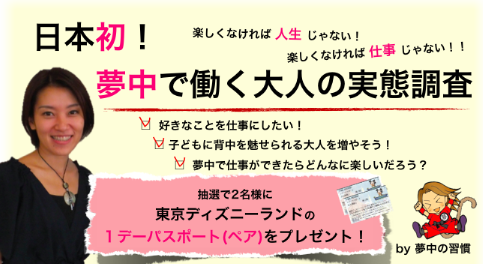 アンケートにお答えいただいた方には、『夢中で働く大人の実態調査の集計結果』、『起業家が夢中で仕事を成功させる夢中探しの授業メール講座』のほか、東京ディズニーランドの1デーパスポートを2組4名様にプレゼント致します。