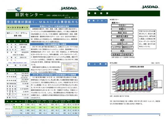 産業翻訳の最大手。特許,医薬,工業,金融の4分野に強みを持つ。リーマンショック以降の業績停滞期から脱却し,11/3期より業績は再び拡大基調に入っている。9月に翻訳者・通訳者の紹介・派遣,国際会議の企画・運営等を手掛ける(株)アイ・エス・エス(及びその子会社2社)を買収により子会社化した。事業領域の拡大とともに・・・