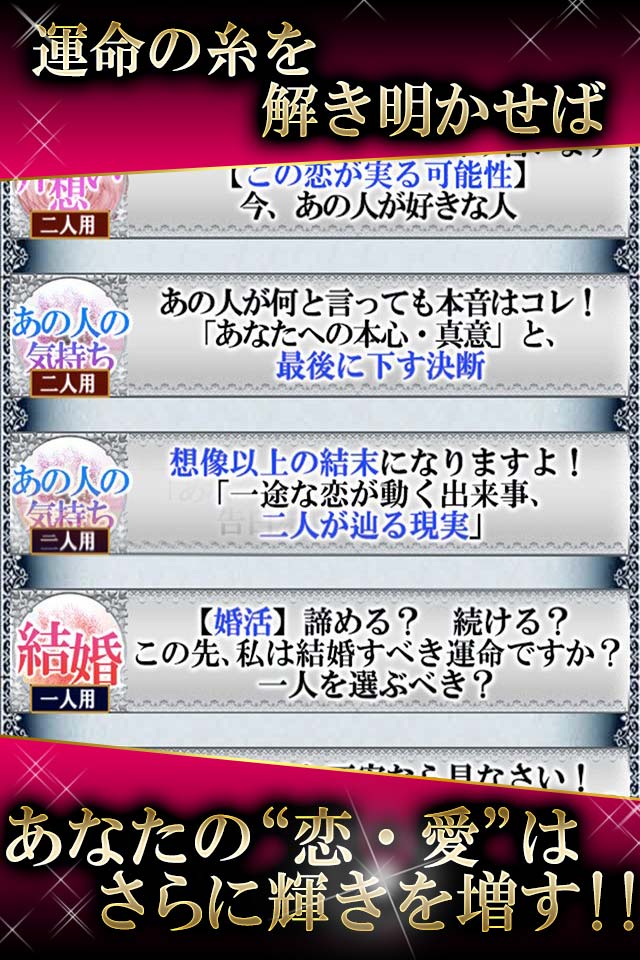 本アプリは、縁命運星占という特別な鑑定法にてあなたに定められた結ぶべき縁と、切るべき縁、赤い糸、黒い糸を明らかにする占いアプリです。