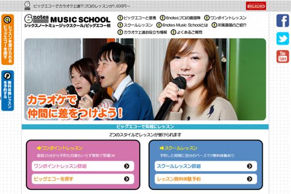 6notes Music Schoolはカラオケビッグエコーと提携して”カラオケボックスの中に常設した”、新しい形の音楽スクールです。1,500円~の「ワンポイントレッスン」から目的に合わせたカリキュラムをご提案する「スクールレッスン」など楽しみながら上達を目指すボイストレーニングを受講することができます。