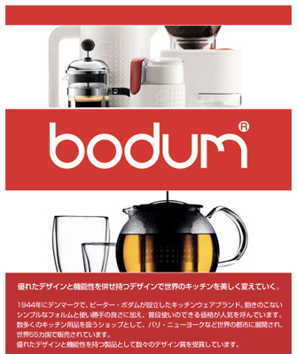 もう一方の「bodum(ボダム)」は、1944年にデンマークで、ピーター・ボダムが設立したキッチンウェアブランドで、飽きのこないシンプルなフォルムと使い勝手の良さに加え、普段使いのできる価格が人気を呼んでいます。北欧の優れたデザインと機能性を併せ持つデザインで世界のキッチンを美しく変えていく製品です。