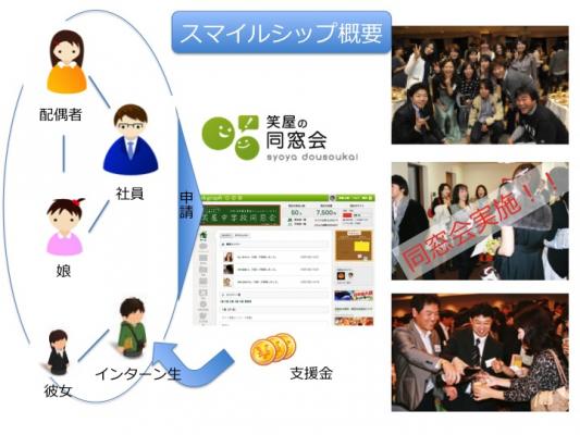笑屋の同窓会サービスは、全国で年間約300回の同窓会開催支援サービスを行っております。今回リリースされた“同窓会グラフ”と既存の同窓会幹事代行サービスを組み合わせる事により、同窓会幹事は手間やリスクなく開催する事が可能です。加えて、スポンサーを付け、会費を下げる事で「リスクなく」「手間なく」「安い」同窓会を開催する事が可能です。