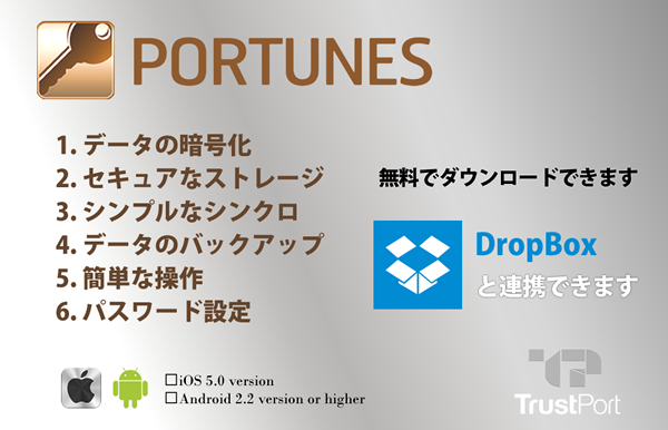 Portunesは、クレジットカード、銀行口座、ユーザー名とパスワード、プライベートノート等を記録でき、パスワードを完全に暗号化し、個人情報をしっかり保護するアプリケーションです。