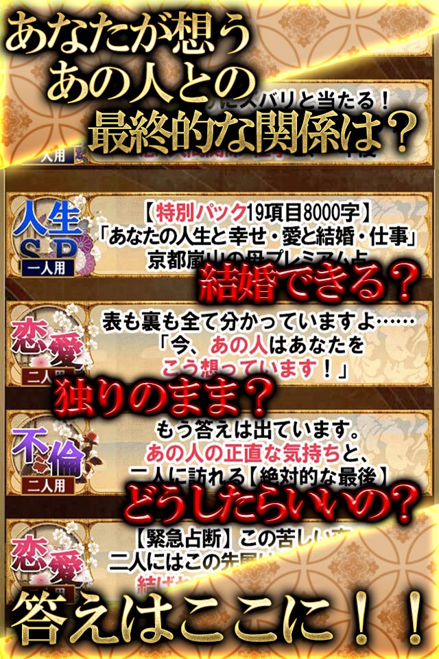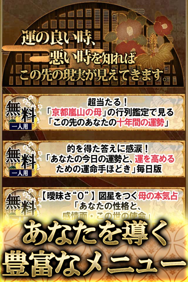 「心がスッキリしました」「京都嵐山の母の後押しで元気になれました」 本アプリは、愛情のこもった鑑定で口コミの「京都嵐山の母」“泰りか”を迎え、特別な占術「源氏推命」を用いて鑑定する占いアプリです。