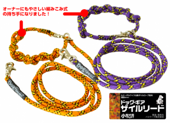 ロープの強度は720kg、金属パーツの強度は110kgですので、15kg位までの中型犬にも使っていただける仕様です。 カラーは従来通りのオレンジとパープル。