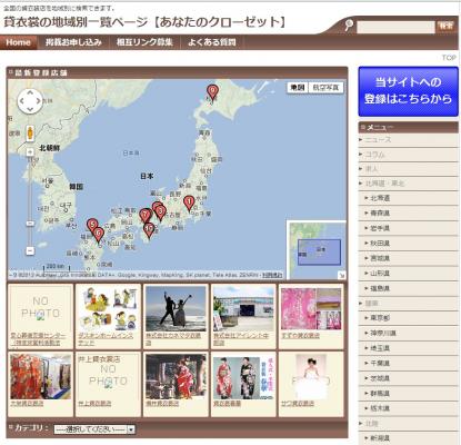 サイト閲覧者は、全国の希望地域ごとに全国の貸衣裳取扱店をマップ表示により、