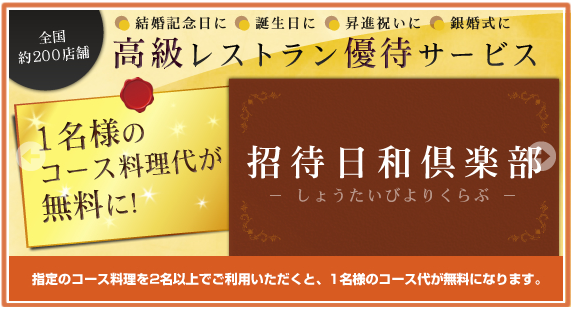 そのうち生活サポート分野のサービスでは約2,000種という多彩なメニューを会員向け特別価格で提供しておりますが、今シーズンもこの生活サポートサービス分野のメニュー拡充を図っております。そのなかで今回ご紹介するのは、お店で指定のコース料理(大体1名様1万円前後~2万円前後)を2名様以上でご利用いただくと1名様分のコース料理が無料になるという、今月から始まった会員サービス『招待日和倶楽部』です。ご利用できるレストランは北海道から九州・沖縄まで全国で約200店舗、いずれも料理自慢の高級レストランばかりです。