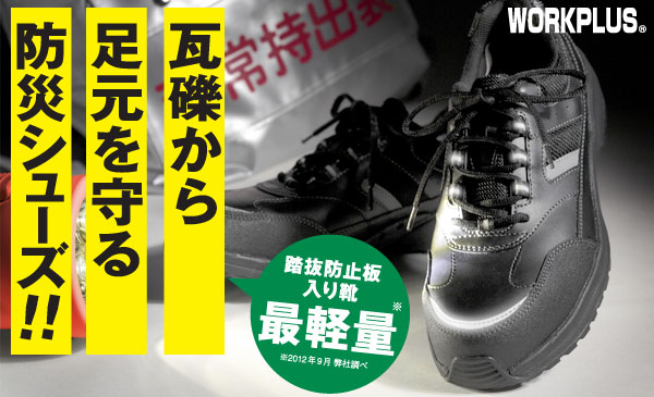 当社では、こうした条例への取り組みに合わせ、“踏抜防止板”を内装し、軽量・コンパクト化を実現した「防災シューズ」を備えておくことを推進しております。