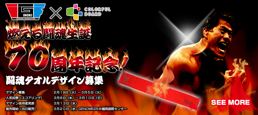 2013年2月20日(水)はアントニオ猪木氏70歳の誕生日です。「闘魂!70th Anniversary アワード」では、アントニオ猪木の代名詞とも言える「闘魂タオル」の70周年特別バージョンデザインをコンテスト形式にて募集いたします。