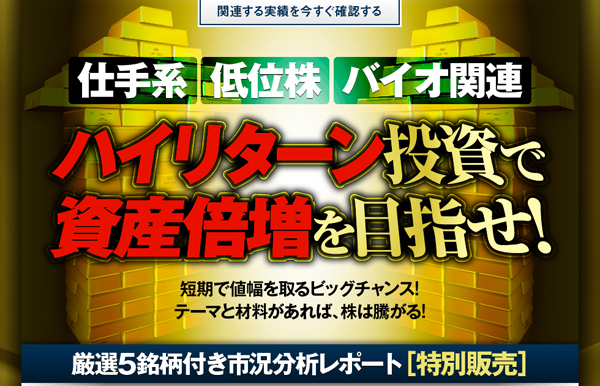 ・商品名:厳選5銘柄付き市況分析レポート「仕手系、低位、バイオ関連株! ハイリターン投資で資産倍増を目指せ!」
