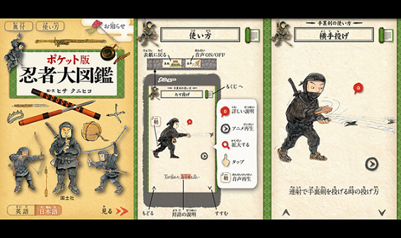 原作の『なるほど忍者大図鑑』(作・絵:ヒサクニヒコ/国土社)は、忍者の武器や道具、術や戦い方などをイラストや写真でわかりやすく説明している図鑑です。本アプリでは、謎に包まれている忍者の生態をアニメーションや音声を利用し、分かりやすく・楽しくご紹介します。