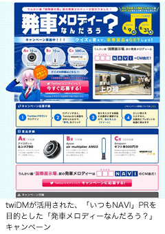 セールスプロモーション事業等を行うゼンリンプロモ様は、地図サービス「いつもNAVI」のCM曲および商品名の認知拡大を目的として、Twitterを活用したプレゼントキャンペーン「発車メロディーなんだろう?キャンペーン」を実施されました。同キャンペーンは、りんかい線(東京臨海高速鉄道)国際展示場駅で「いつもNAVI」のCM曲を流し、その曲が何のCM曲か回答し応募すると、応募者の中から抽選で豪華賞品が当たる、という内容です。プレゼント当選者への通知に、当社の無償Twitter DM一斉配信ツール「twiDM」(http://www.twidm.jp/)をご利用いただきました。