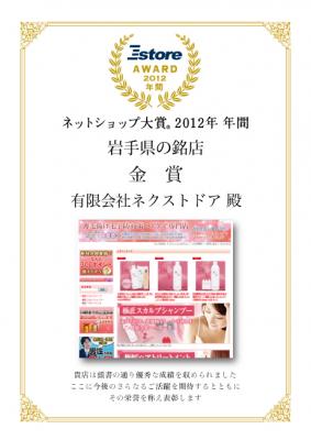 今回、eストアーが主催するeストアープレミアムショップミーティング ネットショップ大賞2012においては売上やリピーター率など総合的な指標から選定され、ネットショップでの岩手県ナンバー1の称号となる「ネットショップ大賞2012 岩手県の銘店 金賞」を受賞する運びとなった。