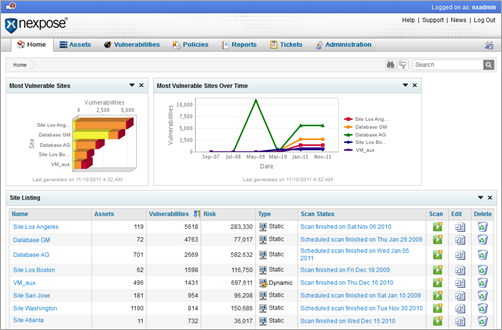 Nexposeは、33,000種類以上の定義された脆弱性と97,000以上のスキャンパターンにより、仮想環境、OS、 Webアプリケーション、 データベースなど、広範囲にわたるセキュリティ上の脆弱性や設定ミスを自動的にスキャンして、IPアドレスを持ったすべての機器について脆弱性が無いか検査します。そして、発見した脆弱性の対策方法についての具体的なアドバイスを表示しますので容易に対策が可能です。Nexposeにより定期的に情報システムの脆弱性をチェックすることで、システムを安全な状態にキープすることができます。