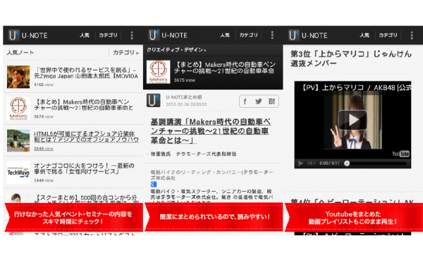 株式会社U-NOTE(本社:東京都杉並区、代表取締役CEO:小出悠人)は、イベントまとめプラットフォーム「U-NOTE」(http://u-note.me)のAndroidアプリを大幅刷新し、「イベントまとめビューワー」として「auスマートパス」にて2013年2月26日より提供開始しました。またiPhone向けauスマートパス内でも厳選コンテンツに掲載されており、こちらはアプリのダウンロードなしですぐにご利用いただけます。