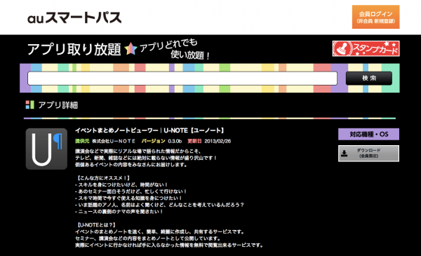 株式会社U-NOTE(本社:東京都杉並区、代表取締役CEO:小出悠人)は、イベントまとめプラットフォーム「U-NOTE」(http://u-note.me)のAndroidアプリを大幅刷新し、「イベントまとめビューワー」として「auスマートパス」にて2013年2月26日より提供開始しました。またiPhone向けauスマートパス内でも厳選コンテンツに掲載されており、こちらはアプリのダウンロードなしですぐにご利用いただけます。