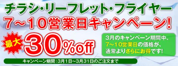 キャンペーン中はサイズ・色数・部数・用紙に関係無く7営業日以上で割引しています。
