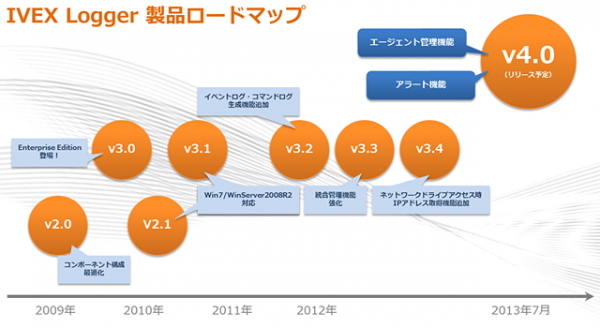 この度アイベクスでは、2013年の製品開発計画を以下の通り発表しました。2013年7月に予定している、「IVEX Logger Seires」のメジャーバージョンアップにより、アラート機能やエージェント管理機能など運用管理機能の拡充を図っていきます。