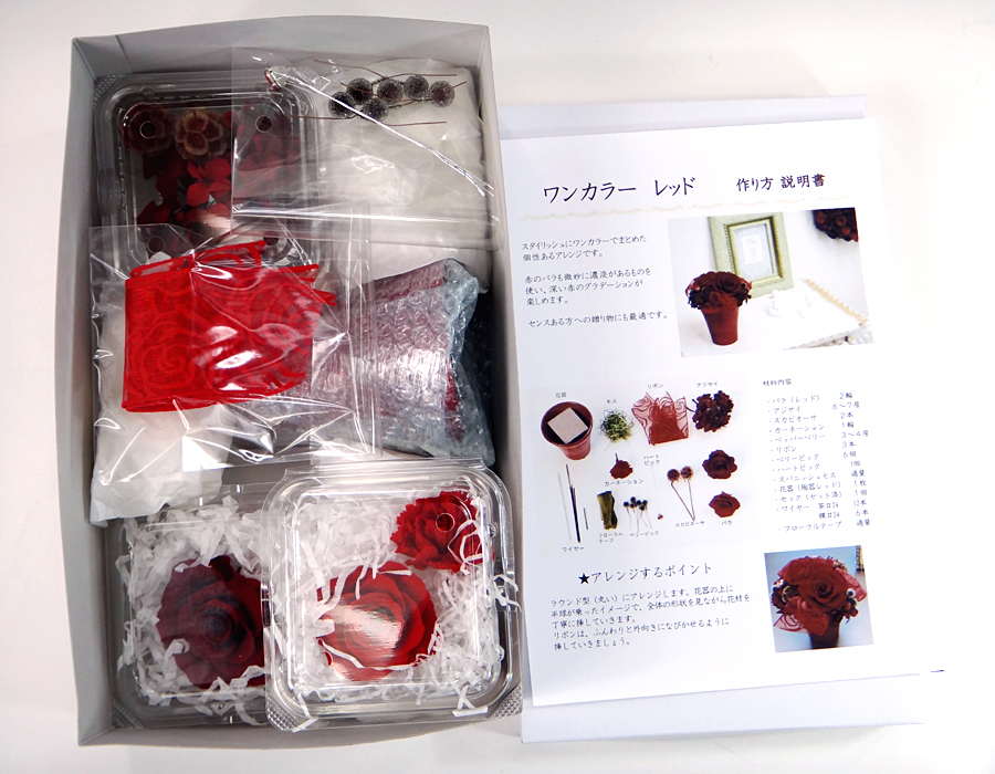 当社はこれまでになかった一色のみで作るプリザーブドフラワーなどの当店のみのオリジナルキットや学校や施設などのイベントで使用するためのキットなど様々なご要望にお応えできるオリジナルのアレンジキットを取り揃えています。