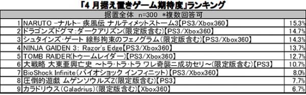 ユーザーが期待する4月発売の新作ソフトトップ3は、1位「NARUTO -ナルト- 疾風伝 ナルティメットストーム3」、2位「ドラゴンズドグマ:ダークアリズン」、3位「シュタインズ・ゲート 線形拘束のフェノグラム」となりました。