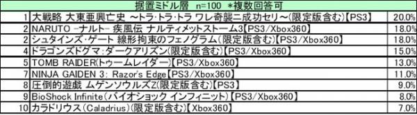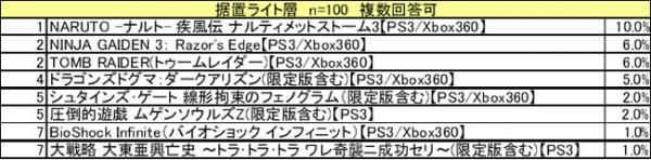 ランキングをプレイ頻度別に見てみると、ヘビー層では「NINJA GAIDEN 3: Razor's Edge」が、ミドル層では「大戦略 大東亜興亡史 ~トラ・トラ・トラ ワレ奇襲ニ成功セリ~」が1位に、ライト層では「TOMB RAIDER」が3位にランクインしています。