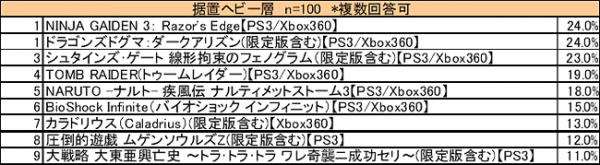 ランキングをプレイ頻度別に見てみると、ヘビー層では「NINJA GAIDEN 3: Razor's Edge」が、ミドル層では「大戦略 大東亜興亡史 ~トラ・トラ・トラ ワレ奇襲ニ成功セリ~」が1位に、ライト層では「TOMB RAIDER」が3位にランクインしています。
