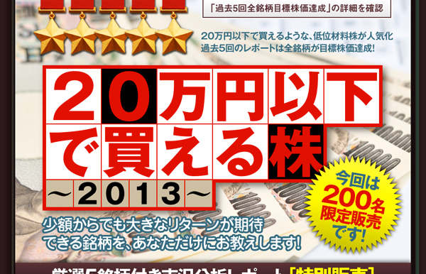 ・商品名:厳選5銘柄付き市況分析レポート「5回連続パーフェクト!! 20万円以下で買える株[2013]」