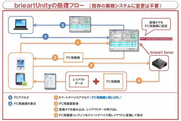 「brieartUnity (ブリエアートユニティ)」 はPC用Webサイトをスマートデバイス向けに変換するシステムです。このシステムを使用することで、既存のWeb業務システム等に対して変更を加えることなく、スピーディかつ低コストで効果的にスマートデバイス対応が実現できます。