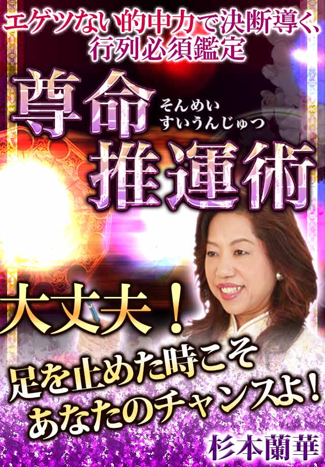 尊命推運術では、社会に出てから矯正または強化された後天的性質を表す【現実星】と、現実星の奥に隠された本来の先天的性質を表す【理想星】を読み解きます。この二つの星を同時に視ることで、より深く相談者の環境や周囲の人々との関わり、現在の状況を把握することができるのです。そして、相談者自身も気づいていない本質を見抜き、願いや悩みを解決し不安を解消します。一人だけで悩んでいても答えが見つからない時、決断できずに立ち止まった時こそ、杉本蘭華の言葉があなたの背中を押してくれるでしょう。