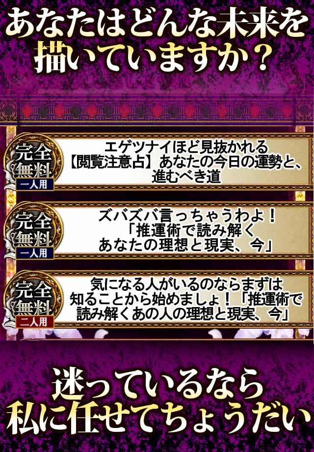 本アプリは、この的中率エゲツナイ!当たると口コミ話題の鑑定士「杉本蘭華」が独自の占法『尊命推運術』を用いて鑑定する占いアプリです。自身の事を深く知り、活かすことで幸せが訪れます。予約が取れないこの鑑定を是非アプリでお楽しみ下さい。