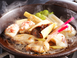 鯛やサワラなどの瀬戸内の旬と、ウドやフキノトウなどの地元美作里山の旬を、やさしく味噌で合わせて焼き上げたお料理です。