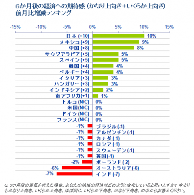 6か月後の景気については、日本の調査対象者の18%が「良くなっているだろう」と回答した。これは前月比10ポイントの上昇で、調査対象24カ国中最も高い上昇幅であった。