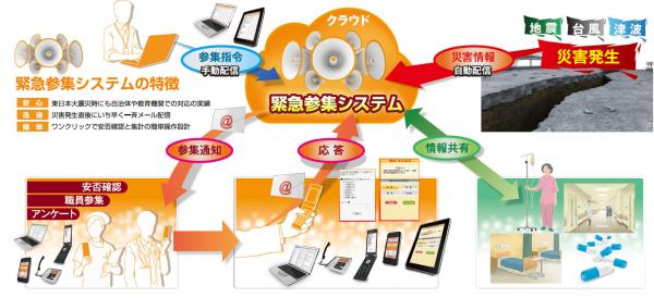 緊急参集システムは、モバイルサイトのCMS(LISAPLUS K2)をベースに開発されたメール一括配信型の幅広い用途を補う情報配信支援システムです。必要な情報をメールやブラウザを通じて的確に配信することが可能であり、なおかつ参集指令や安否確認などのアンケートによる回答状況をリアルタイムで集計する機能も備えていますので、市役所や企業だけでなく、消防本部や要援護者施設、病院そして学校に至るまで、幅広い状況で活躍します。