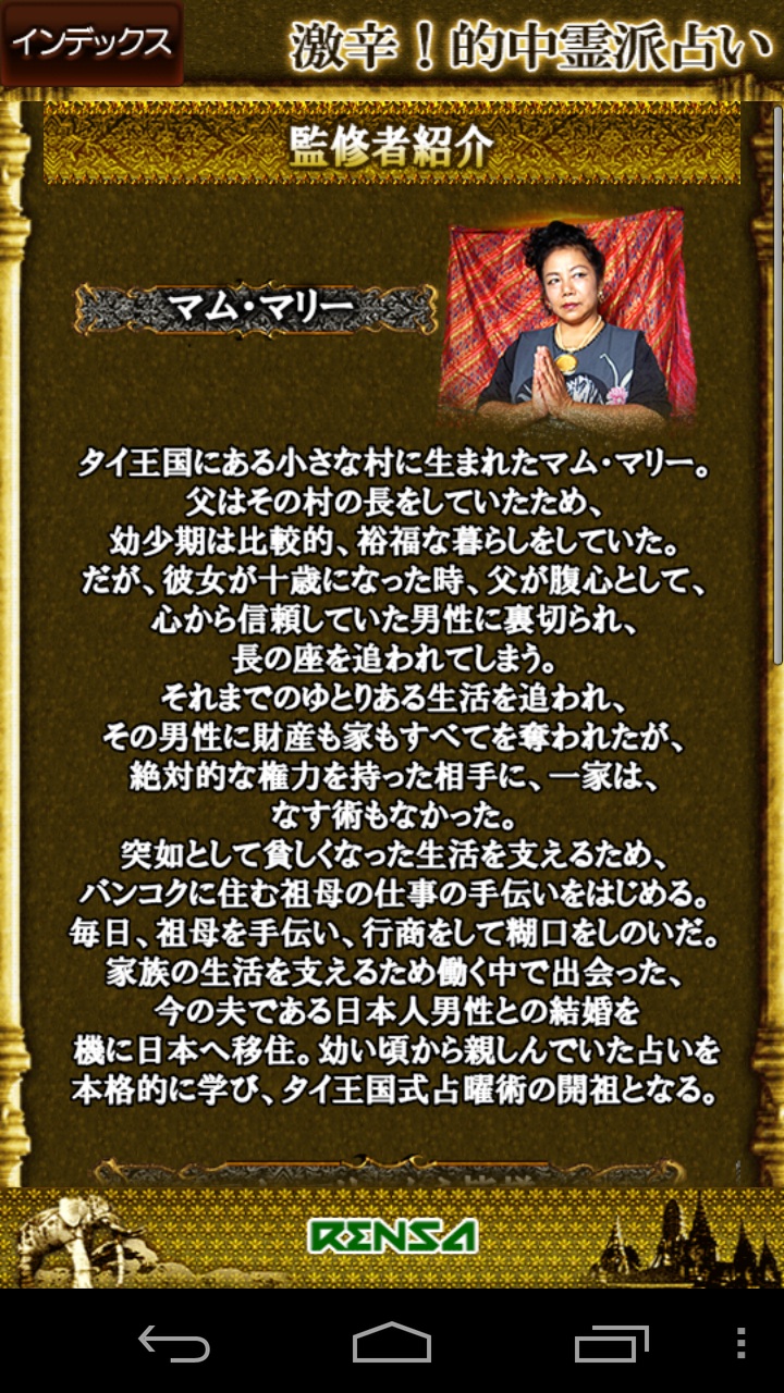 タイ王国にある小さな村に生まれたマム・マリー。 父はその村の長をしていたため、 幼少期は比較的、裕福な暮らしをしていた。 だが、彼女が十歳になった時、父が腹心として、 心から信頼していた男性に裏切られ、 長の座を追われてしまう。 それまでのゆとりある生活を追われ、 その男性に財産も家もすべてを奪われたが、 絶対的な権力を持った相手に、一家は、 なす術もなかった。 突如として貧しくなった生活を支えるため、 バンコクに住む祖母の仕事の手伝いをはじめる。 毎日、祖母を手伝い、行商をして糊口をしのいだ。 家族の生活を支えるため働く中で出会った、 今の夫である日本人男性との結婚を 機に日本へ移住。幼い頃から親しんでいた占いを 本格的に学び、タイ王国式占曜術の開祖となる。