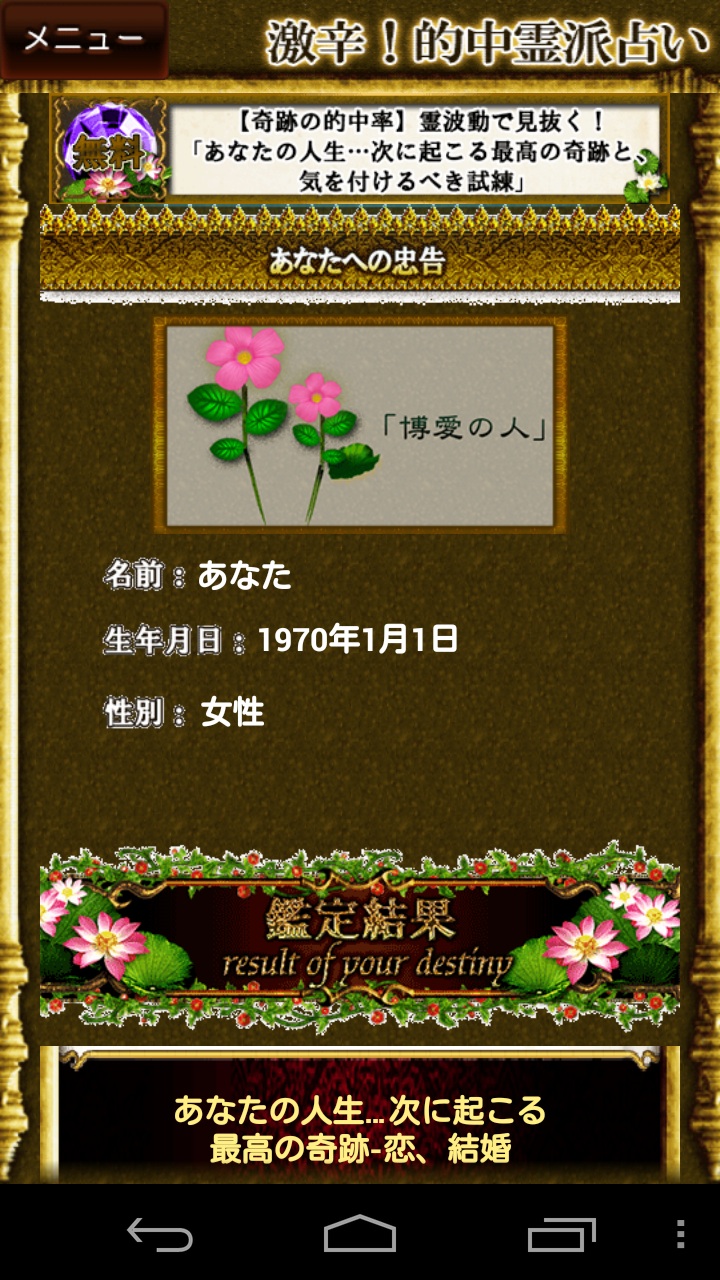 本アプリではあなたがもった霊的な力や、生まれ持ったオーラを見抜き、その自然の摂理に従ってあなたがどのように生きるべきかを心を込めてお教えします。