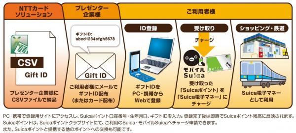 法人企業様(贈り手)は、電子メールの文章内やWeb画面上に固有の16桁のIDを表示、もしくはカードやチラシ、シール等に様々な媒体に印刷することでギフトを配布する(贈る)ことができます。利用者(使い手)は、パソコンや携帯情報端末から専用のサイトにアクセスし、入手したIDとSuicaポイントクラブ※2会員情報等を登録することにより、贈られたギフト券面額をご自身の「Suicaポイント口座」に加算することができます。