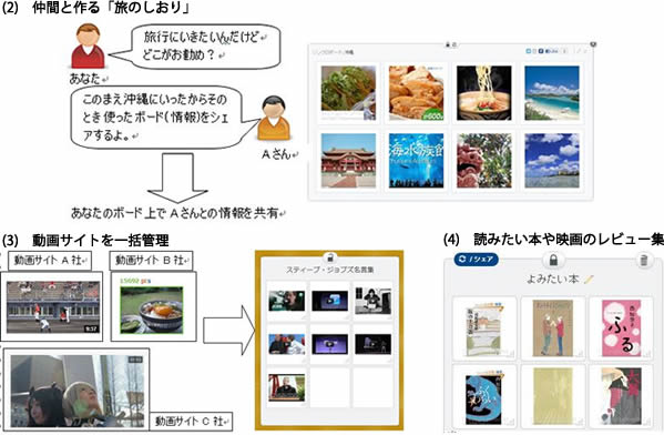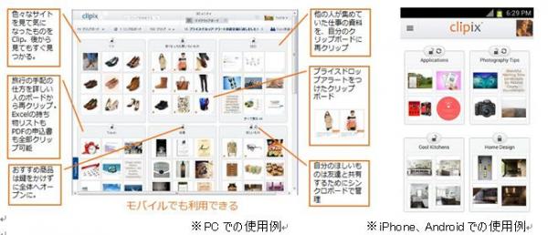 これまでWeb上で読んでみたい記事や、シェアしたくなるレシピ、欲しい靴、友人へのプレゼント候補など、集めた情報はブックマーク(お気に入り)で管理していました。しかし、情報量が増えると、折角、保存した情報も、どれが見たいものか見つけられずにイライラすることも多くありませんか?そんな煩雑になりがちなネット上での情報を、使う時間と場所、さらにはファイル形式(動画・テキストなど)に関わらず、気になった時に気になった情報をカテゴリーに分けてクリップできます。クリップした情報をサムネイルで一覧表示し、保存内容を視覚化することで、見たい物がすぐ見つかり、カンタンに整理ができるWebツールです。