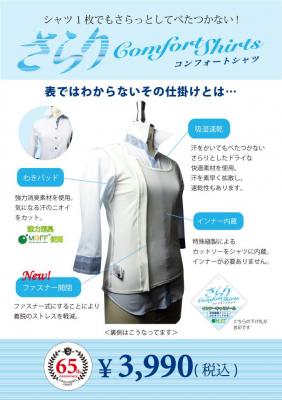 COOL BIZは男性だけではない!女性だって快適な夏を過ごしたい。そんなビジネスウーマンにむけた機能性付シャツが進化して今年も登場。昨年1万枚を約2か月でほぼ完売致しました。キャミソールを着なくても、シャツの裏地に特殊縫製で縫い合わせたインナーが下着の透け感を防ぎます。気になる脇汗も消臭効果素材のわきパッドがしっかりガード!この一枚でスッキリさらりと着こなして戴けます。インナーはサイドのファスナーで開閉する仕様。胸元の隙間も気にならないように考慮しております。女性の「気になる」を解消した一着がいよいよ登場です。