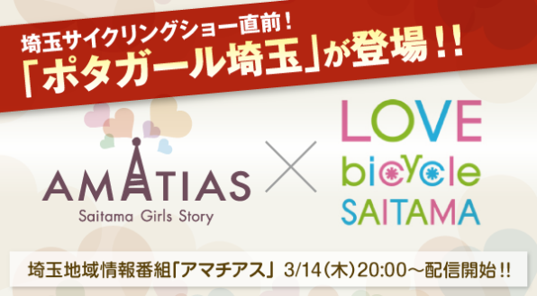 3月14日(木)のアマチアス(制作配信:パンダスタジオさいたま(運営:エクシム株式会社))では、ポタガール埼玉のメンバーをゲストに招き、自転車ライフや埼玉県で走る楽しさなどをうかがいます。さらに、自転車で埼玉を盛り上げる「LOVE Bicycle SAITAMA」広報キャンペーンを展開する埼玉県庁広聴広報課の担当者も招き、ポタガール埼玉も参加する自転車見本市「埼玉サイクリングショー(3月20日開催、主催:埼玉県)」の見どころなどについても語っていただきます。