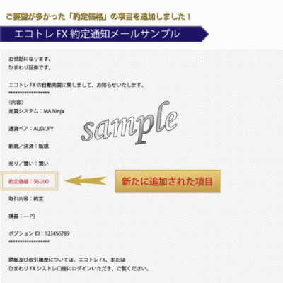 「エコトレFX」の約定通知メールに、お客様よりご要望が多かった「約定価格」の項目を追加いたしました。これにより、「エコトレFX」へログインせずにメールにて約定価格の確認ができるようになり、利便性がますます向上しました。