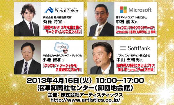 クラウド導入支援・ホームページ制作を展開する株式会社アーティスティックス(本社:静岡県駿東郡長泉町 代表取締役:長岡善章)は、2013年4月16日(火)、沼津卸商社センター(駿東郡清水町卸団地203番地)で、『クラウド経営フォーラム2013in沼津・三島』を主催します。
