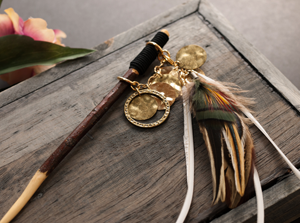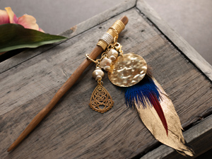 「fugue(フーガ)」は、石に木や布、糸等といった異素材を組み合わせる、ほぼ一点もののアクセサリーブランドです。いつもはネックレスやピアスなどがメインですが、3月14日(木)に新しい「木と羽のかんざし」がデビューしました。