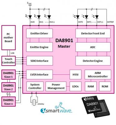 高度に集積されたパワーマネジメントIC、オーディオ、短距離無線技術のリーディング・サプライヤーであるダイアログ・セミコンダクターは本日、マルチタッチ集積回路(MTICTM)であるSmartWaveTM(製品型名DA8901)の提供開始を機に、タッチスクリーンセンサの分野に事業を拡大すると発表しました。MTICは、量産向け民生機器に対して、FlatFrog社のPSDタッチ・テクノロジーの実装を可能にする世界初のチップです。内蔵レンズ赤外線を使ったFlatFrogのPSDタッチシステムは、手袋をした指やスタイラスなどによるさまざまなタッチ、ジェスチャ、圧力の検出・追跡を、最新の静電容量方式ソリューションを超える性能で、低コストに実現することで、より自然で、臨場感溢れるリアルなタッチ体験をエンドユーザに提供します。