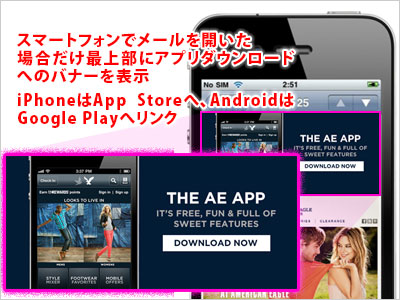 iPhoneやiPad、Android、PCなど、メールを開いたデバイスに応じて自動で表示画像やリンク先を変えることが可能です。たとえばiPhoneとAndroid双方のユーザーへ、一通のメールからアプリケーションの起動やダウンロードページへの誘導をワンクリックで行えるようにする、といった活用に最適です。