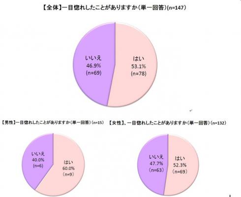 「一目惚れしたことがありますか(単一回答)」という質問に、53.1%が「ある」と回答。男女別の統計では男性が60.0%、女性が52.3%と男性の方が一目惚れ経験の割合が多い事がわかりました。