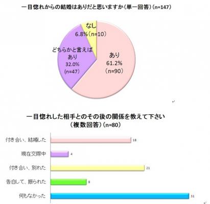 「一目惚れからの結婚はありだと思いますか(単一回答)」という質問に、「あり」と回答した人が61.2%(n=90)、「どちらかと言えばあり」と回答した人が32.0%(n=47)と、『一目惚れ婚』に前向きな考えを持っている人が93.2%にも上る事がわかりました。また、実際に一目惚れした事がある人に「一目惚れした相手とのその後の関係は(複数回答)」と質問したところ、「付き合い、結婚した」と回答した『一目惚れ婚』カップルが全体の約2割にも上る事がわかりました。