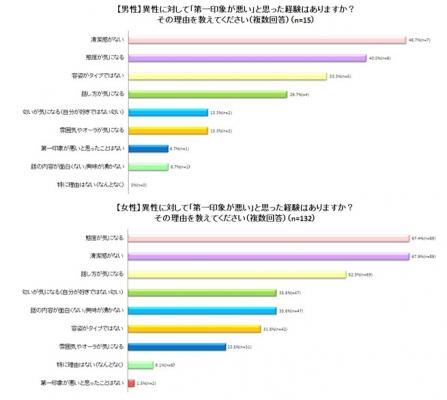 「異性に対して『第一印象が悪い』と思った経験はありますか?その理由を教えてください(複数回答)(n=147)」という質問に対し、「第一印象を悪いと思ったことはない」と回答した人は、わずか2.0%(n=3)で、98.0%(n=144)以上の人が何かしら異性に対して『第一印象が悪いと思った経験がある』事がわかりました。また、『第一印象が悪い』と思った理由の上位に入ったもので、男女共通だったのが「清潔感がない」「態度が気になる」「話し方が気になる」「匂いが気になる(自分が好きではない匂い)」、男女で違いが出たのが男性では「容姿がタイプではない」が、女性では「話の内容が面白くない/興味が湧かない」が上位に入りました。このことから、男性にとって第一印象では容姿が、一方女性では容姿ではなく、話の内容が重要である事がわかりました。